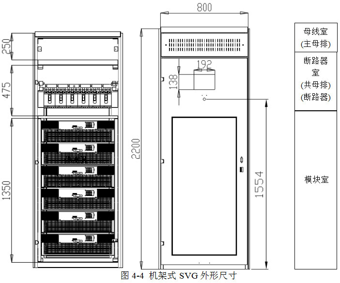 设备从上至下分三部分,顶端为母线室,250mm高,穿过低压成套设备的主母排。第二部分为断路器室,475mm高,每个模块分配一个断路器,多个断路器通过内部共母排连接,共母排与母线室的外部主母排相连。下方为模块室,1350mm高,单柜可放6个模块。
